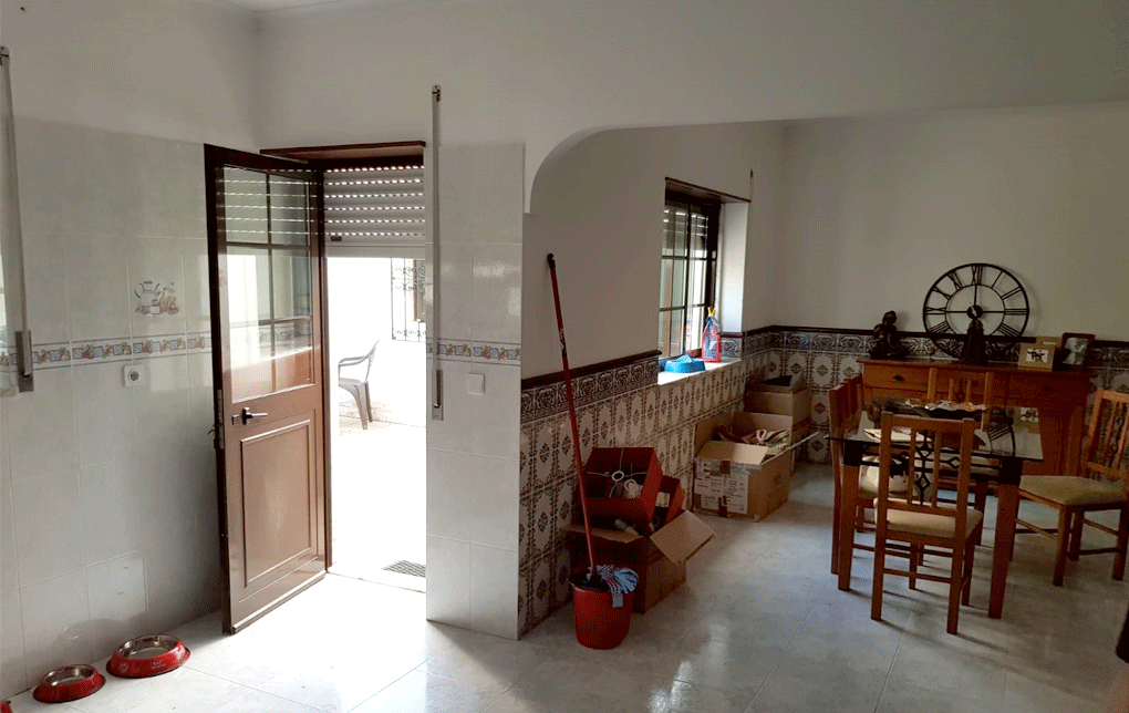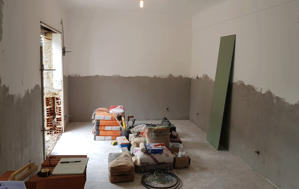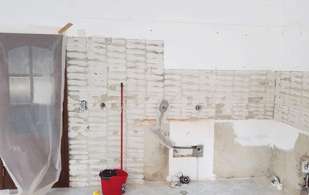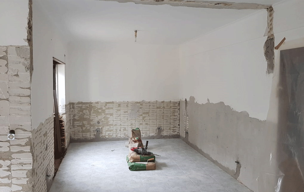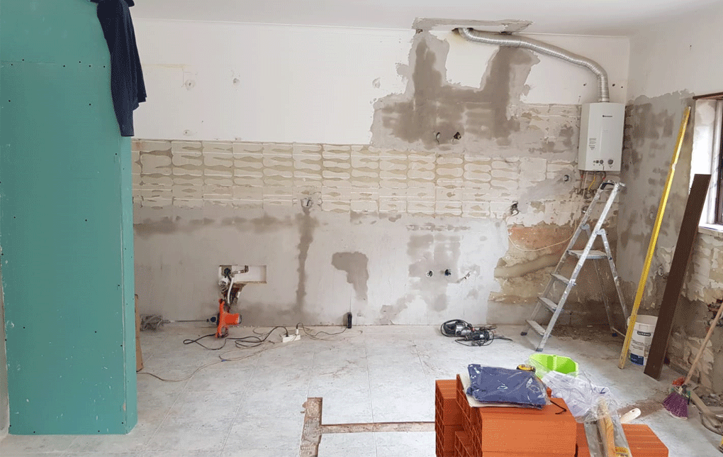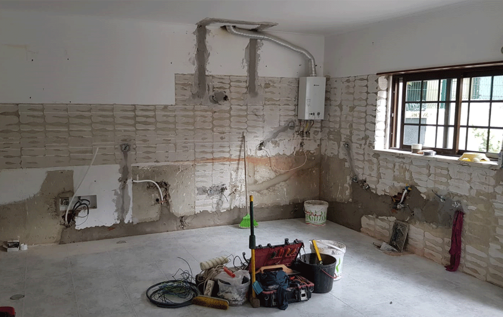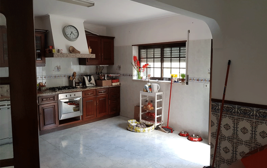 Planeamento 3D, Cozinha, Equipamentos, pavimento cerâmico, ampliação de vão existente