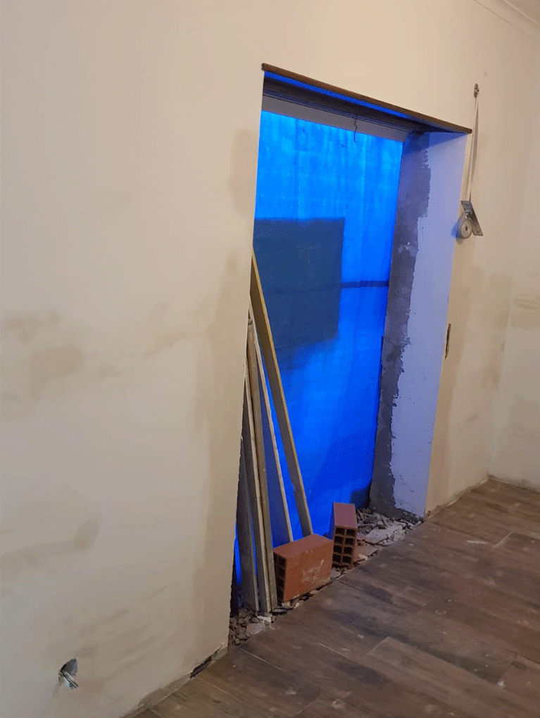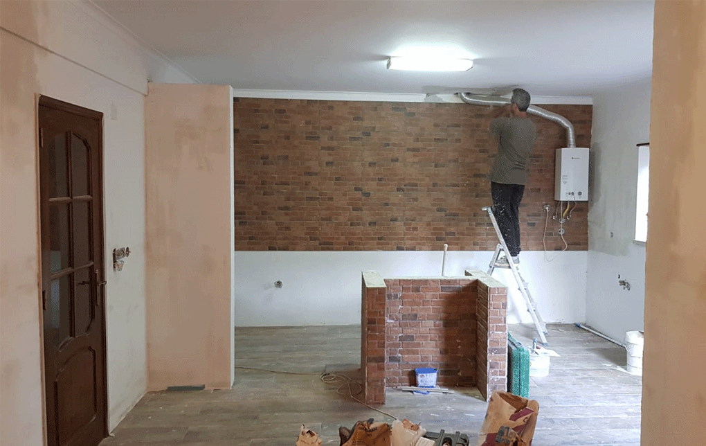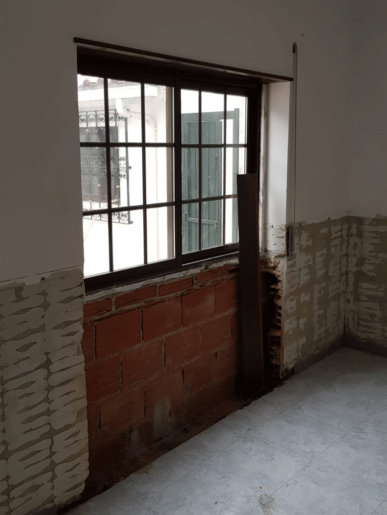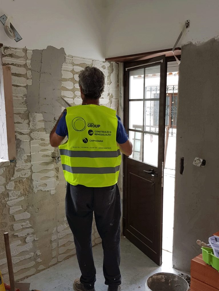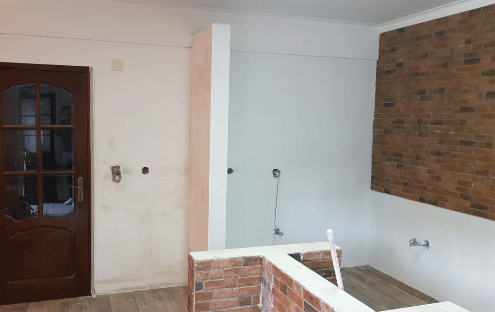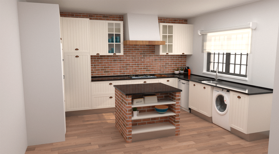 Planeamento 3D, Cozinha, Equipamentos, pavimento cerâmico, ampliação de vão existente