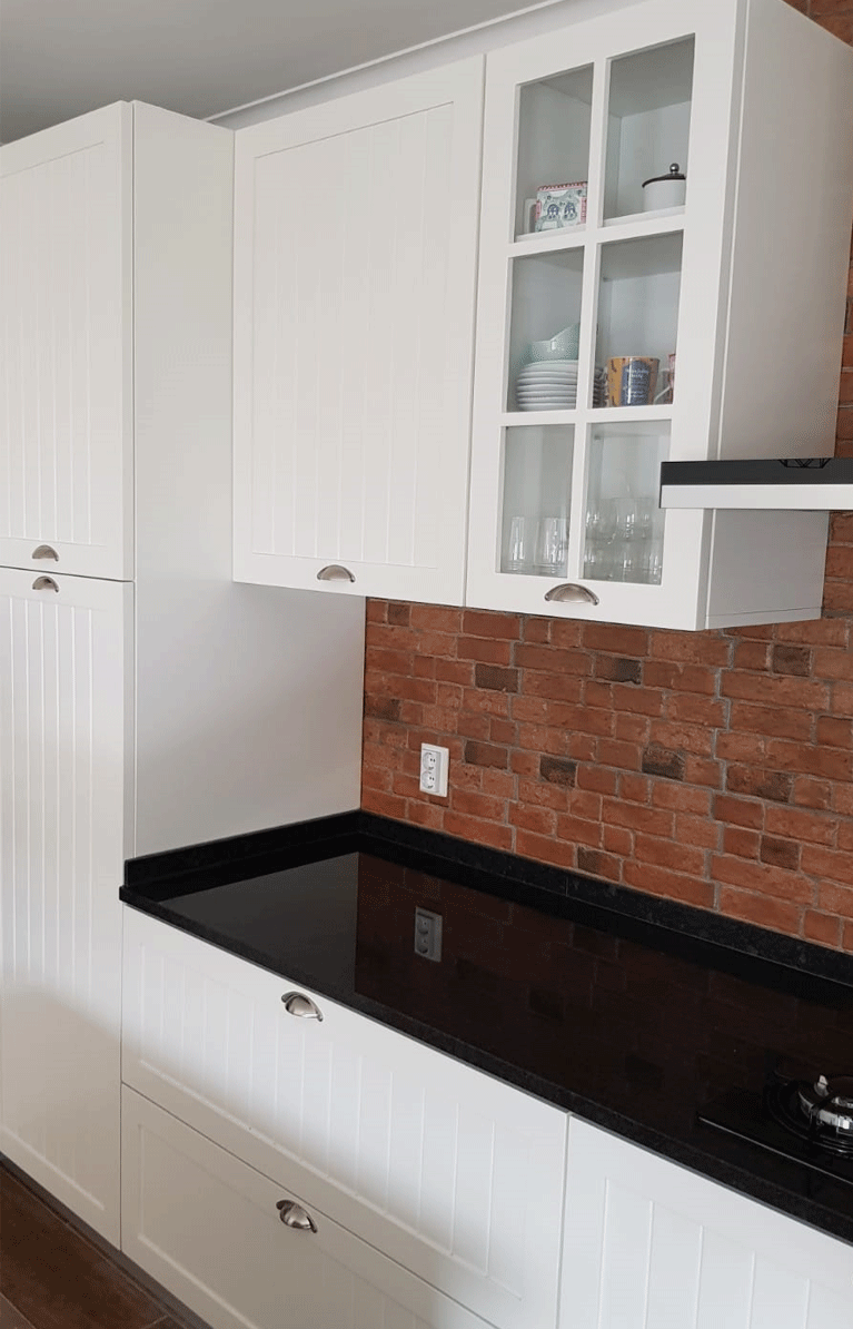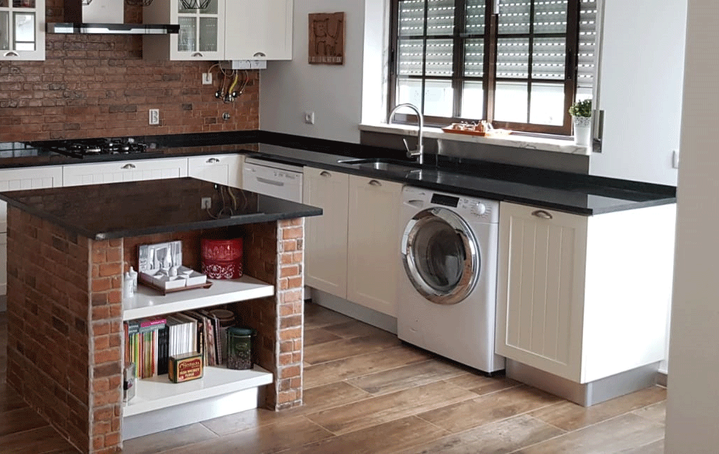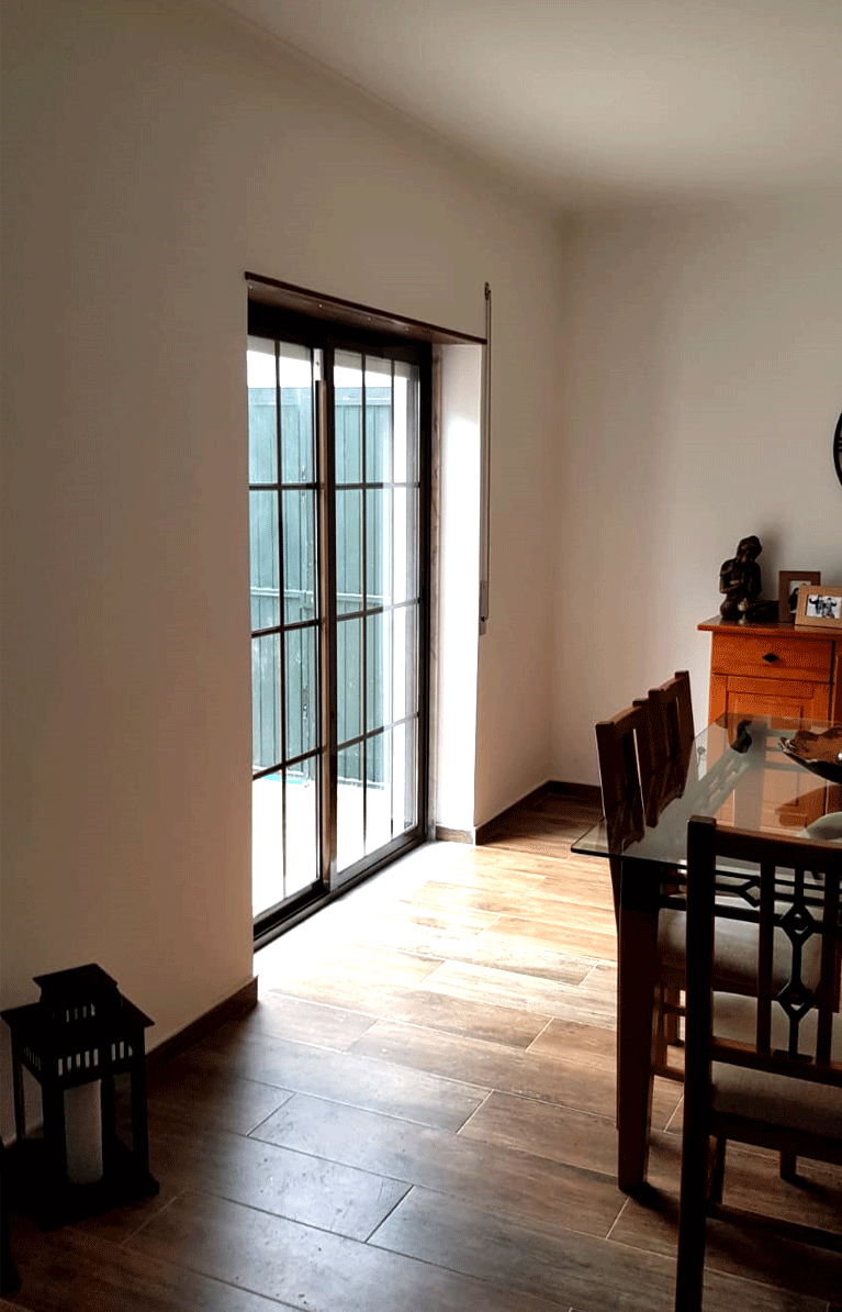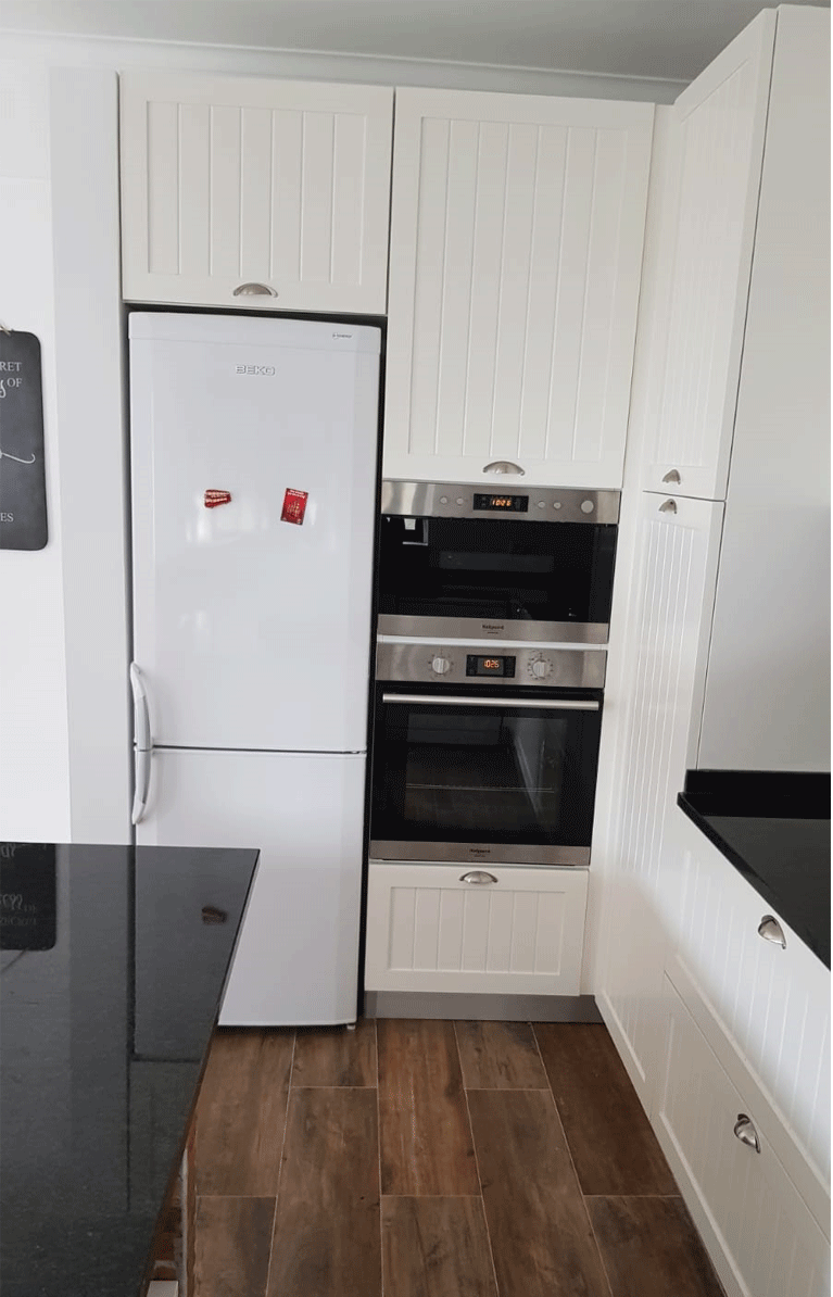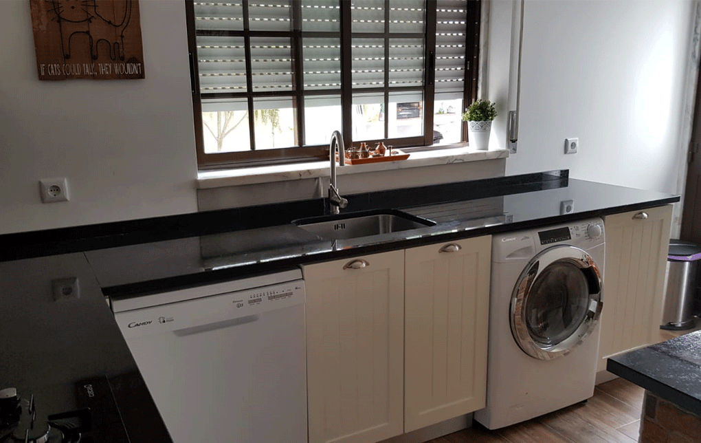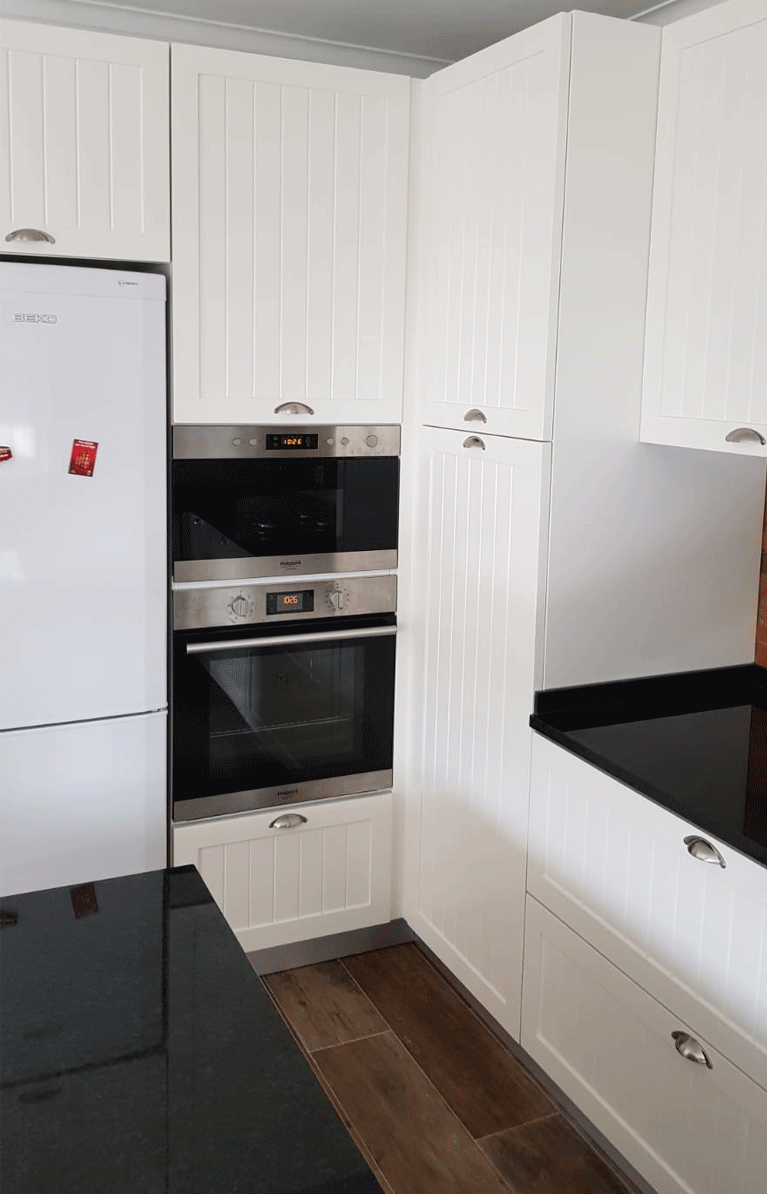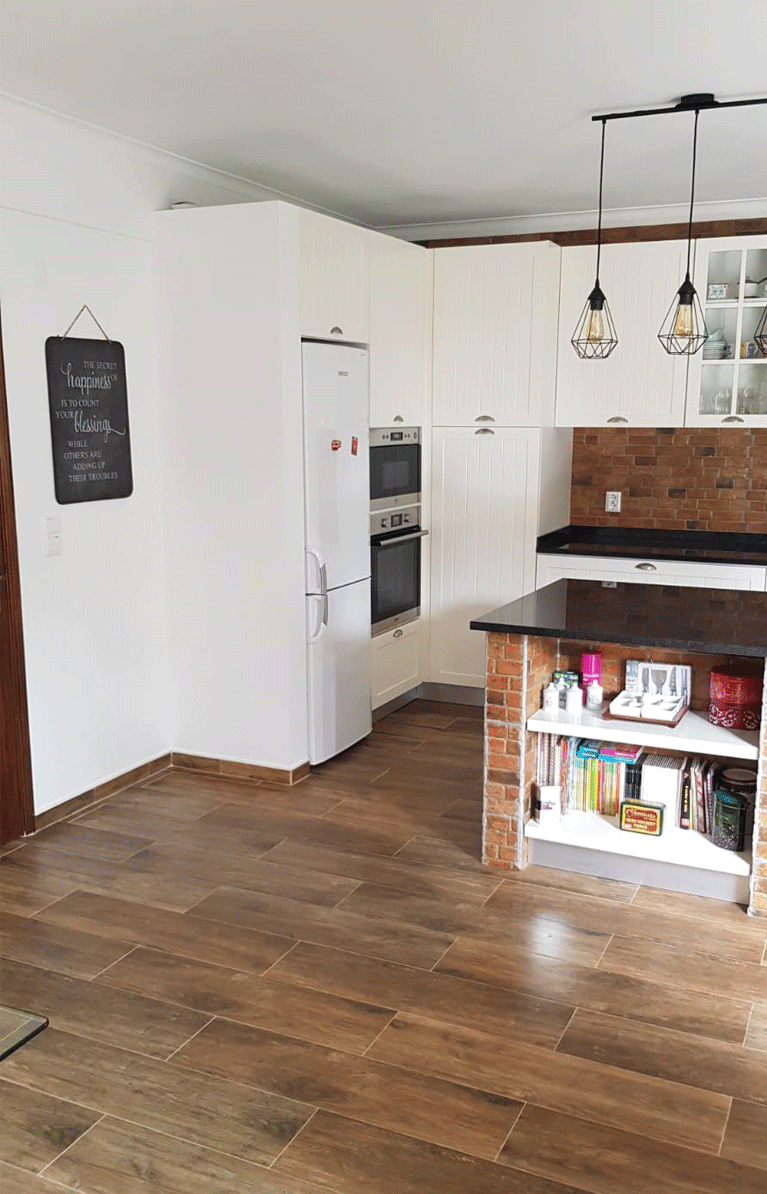 Uma cozinha nova com alguns trabalhos de remodelação. A janela da sala de jantar foi aumentada e colocou-se uma sacada nova a combinar com a caixilharia existente. Pintura, gesso cartonado para embutir as Colunas e revestimentos novos foi apenas o início, acompanhado de desenhos virtuais antes de seguir para produção, os móveis lacados a um tom suave com o efeito de ripas deu a esta cozinha um aspecto vintage. Para a bancada foi escolhido granito negro angola
