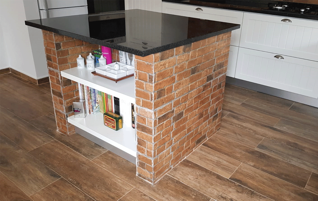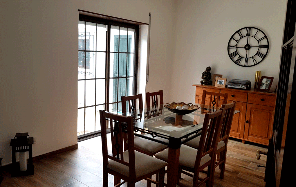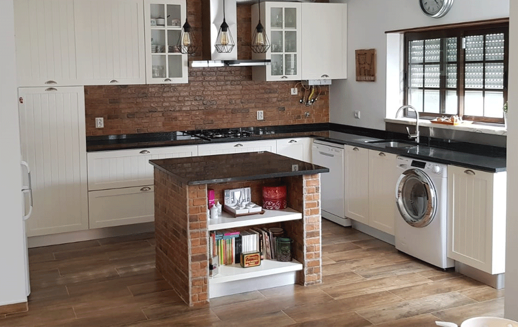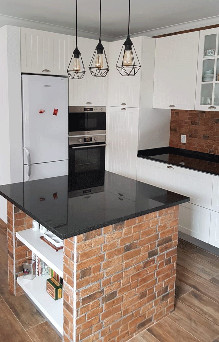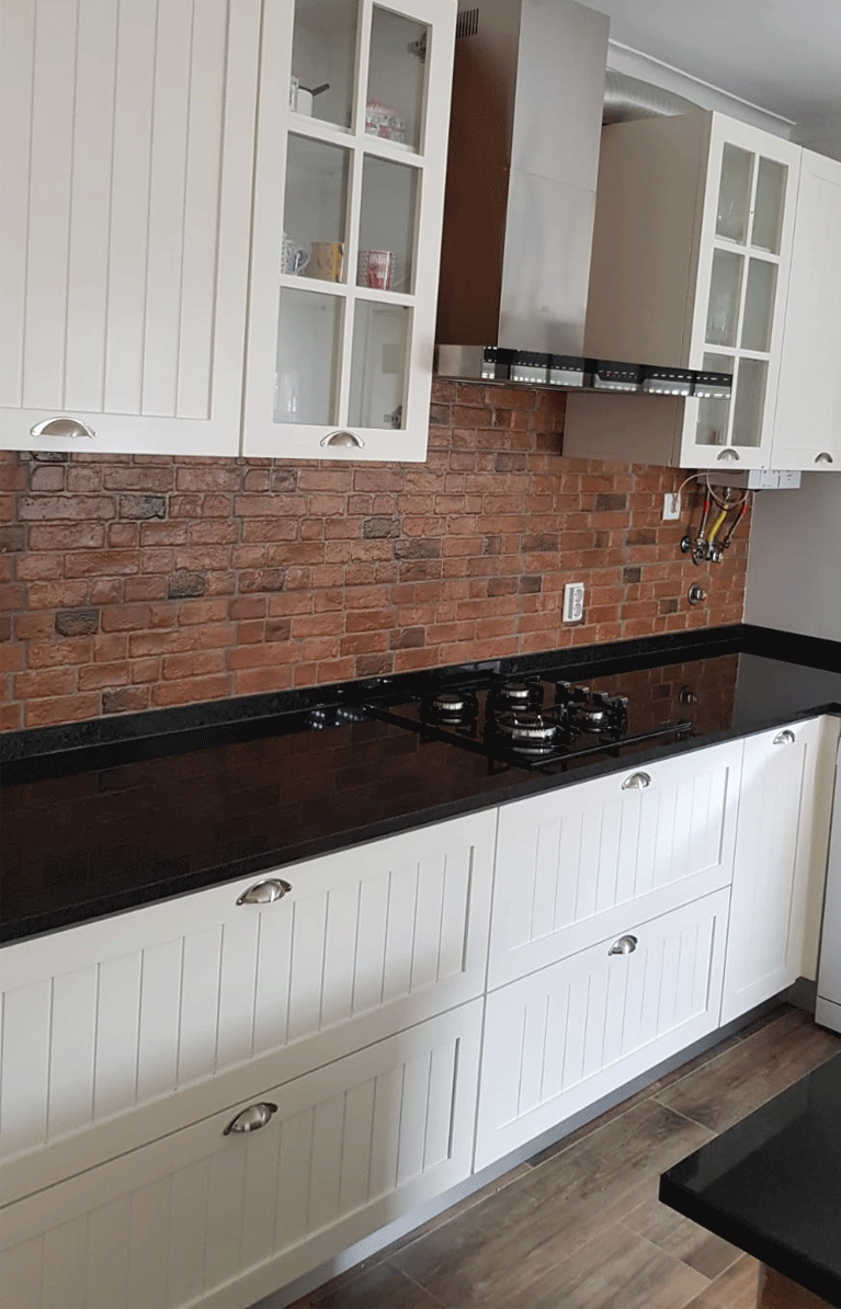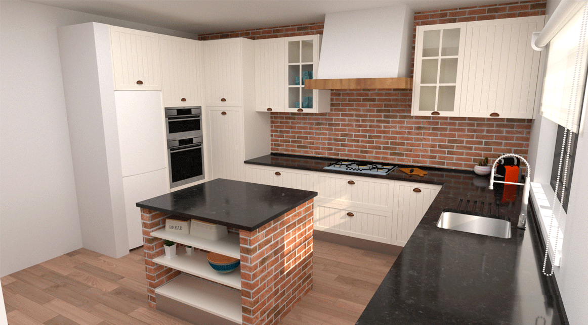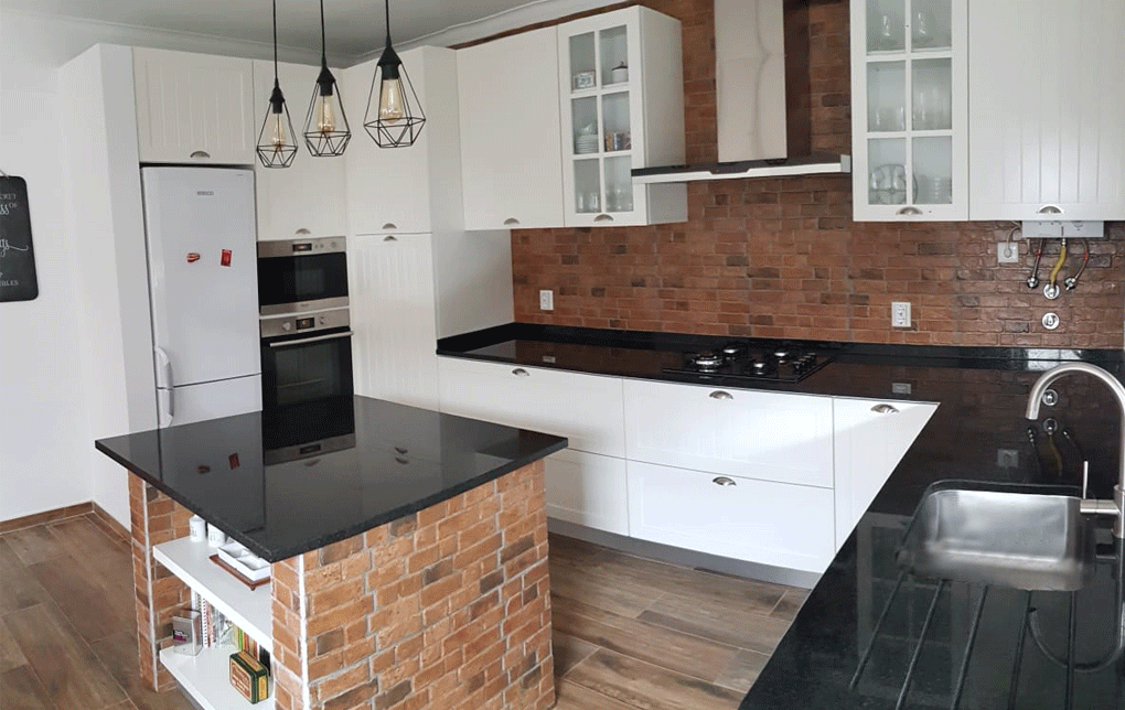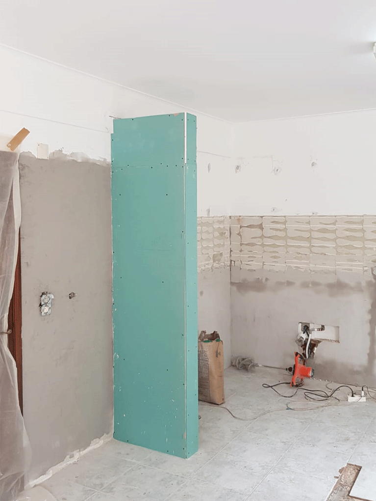 Uma cozinha nova com alguns trabalhos de remodelação. A janela da sala de jantar foi aumentada e colocou-se uma sacada nova a combinar com a caixilharia existente. Pintura, gesso cartonado para embutir as Colunas e revestimentos novos foi apenas o início, acompanhado de desenhos virtuais antes de seguir para produção, os móveis lacados a um tom suave com o efeito de ripas deu a esta cozinha um aspecto vintage. Para a bancada foi escolhido granito negro angola